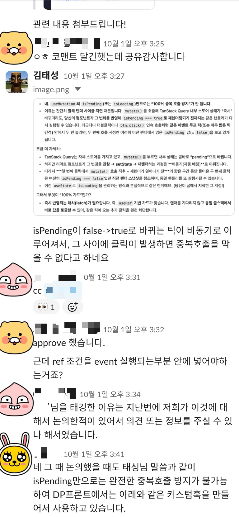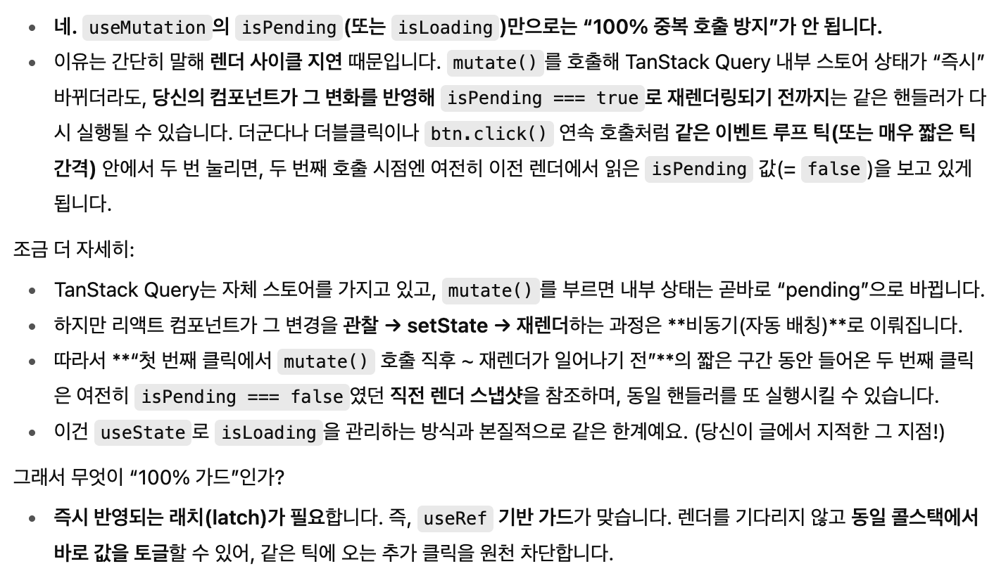 저는 프로젝트에서 react-query의 useMutation을 사용해 API 호출을 하는 곳에 useLoadingGate 훅을 도입하였는데요, 팀원분이 isFetching으로 막을 수 있지 않냐는 코멘트가 달렸었습니다. 리액트쿼리에서 제공하는 isFetching도 마찬가지로 리액트 state입니다. 때문에 앞서 설명드린 state가 중복 호출을 막지 못하는 동일한 이유와 문제를 가지고 있습니다.